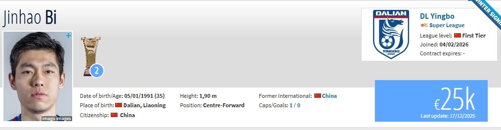 德转:原山东泰山球员毕津浩正式加盟大连英博